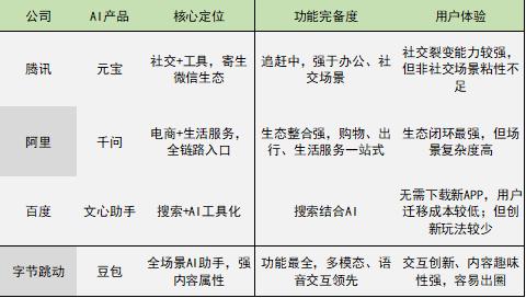 腾讯元宝走社交增强型工具路线,最大优势是寄生微信生态(可惜被封杀了,需要另寻他路),在办公(腾讯会议)、轻社交等场景有优势;但上桌较晚,且非常谨慎,被评价“气质像理工男”。