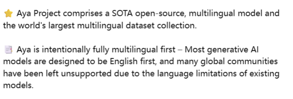在Cohere任职期间,Sara Hooker曾大力推动Aya项目。该项目汇集了来自119个国家的3000名计算机科学家,将先进AI能力应用于数十种主流模型表现不佳的语言,同时使用相对紧凑的模型规模。