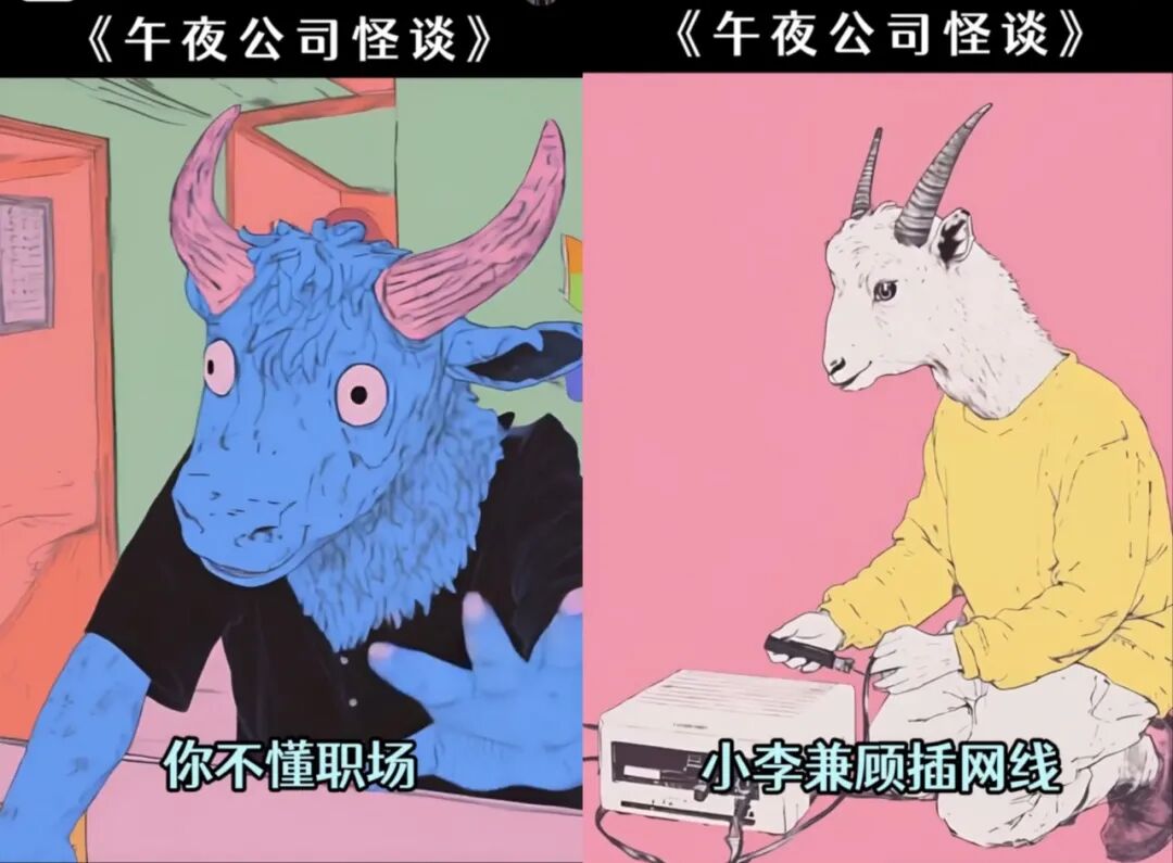 很快,《午夜公司怪谈》一炮而红。在这个小短片里,穿着T恤的牛,在公司加班,公司断网,网线没插好,但“想插这个网线得先立项,总监三天后做了批复,需要连夜开会商量……预算不够,人事提议加个内部headcount,小李兼顾插网线……”