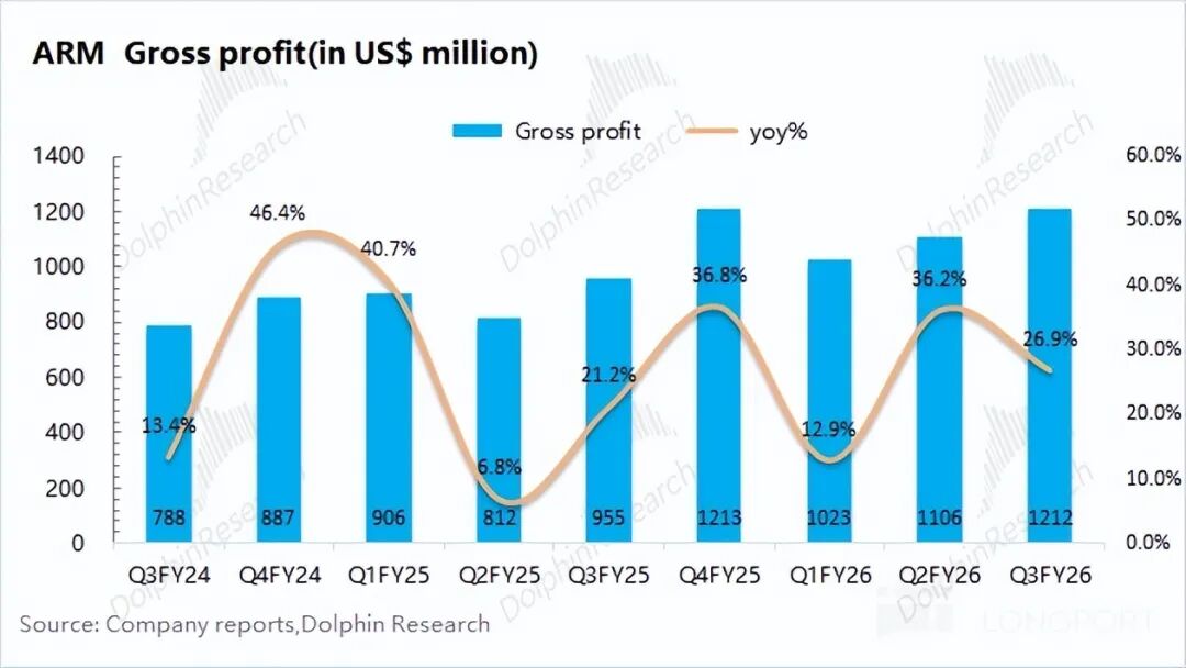 1、主要数据:Arm 本季度实现收入 12.4 亿美元,同比增长 26%,符合市场预期(12.3 亿美元)。公司本季度收入端环增的 1 亿美元中,主要来自版税业务的增长贡献。公司毛利率为 97.6%,维持在 97% 以上的高位。