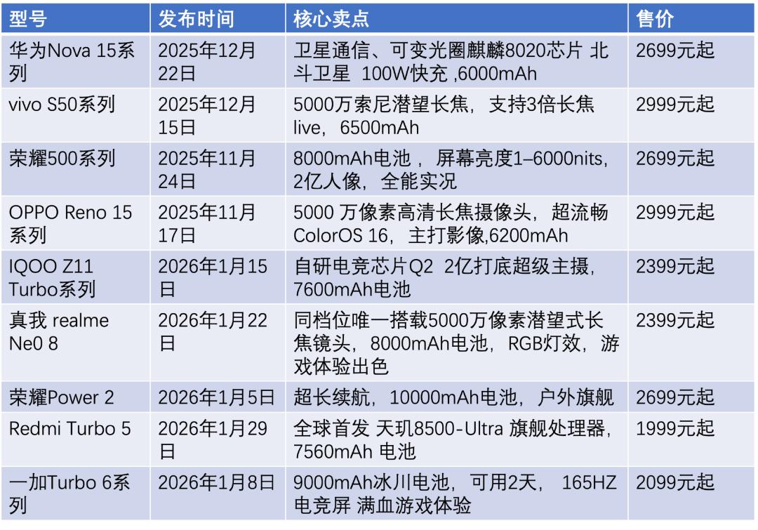 荣耀Power 2主打续航,配备10000mAh电池,号称一次充满可以32.5小时沉浸看剧,堪称移动充电宝;OPPO Reno 15系列主打影像,5000 万像素高清长焦摄像头;一加Turbo 6系列是游戏爱好者的福音,165HZ电竞屏 满血游戏体验.;而华为Nova 15系列则将原本用于旗舰机型的卫星通讯功能下放.......