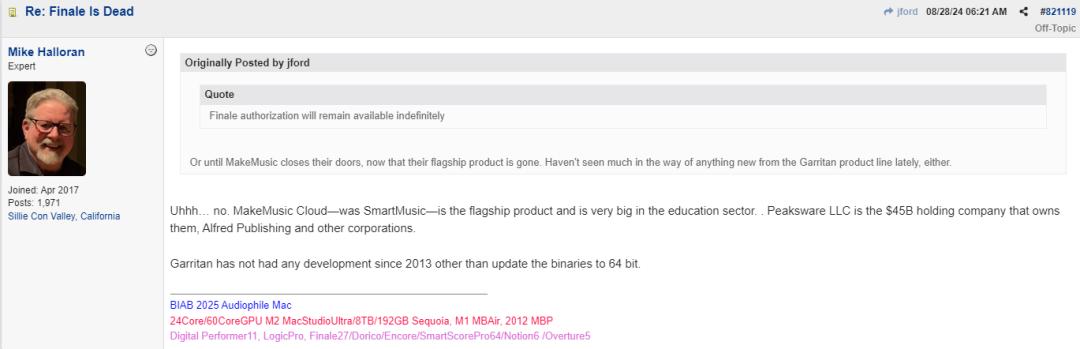 值得注意的是,MakeMusic旗下的音源库Garritan虽然未被正式停产,但目前也已处于边缘化的“维护模式”。不少用户指出,2013年来,Garritan产品线也没看到新东西,认为其后续更新希望渺茫。