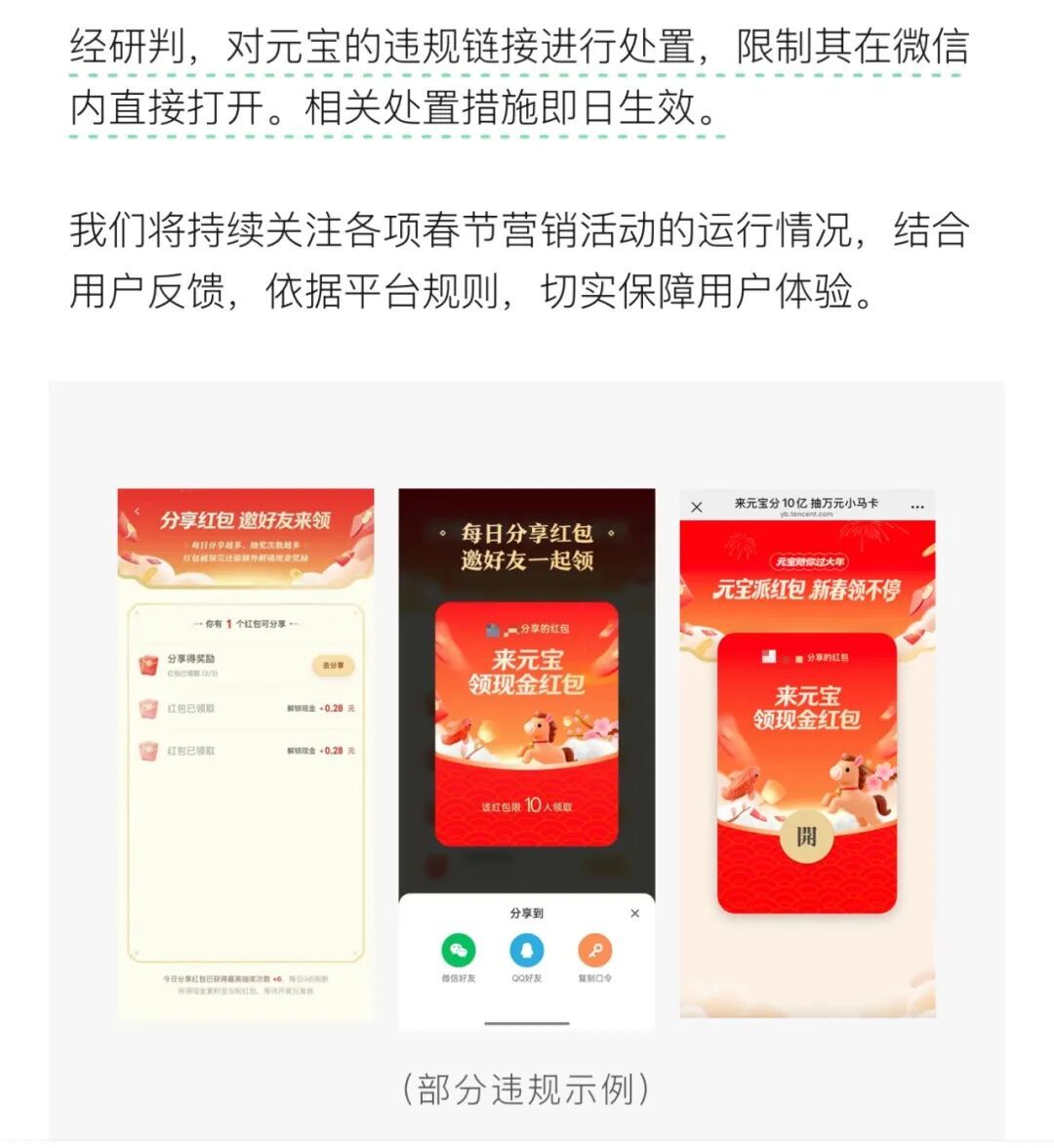 微信对千问的封锁,很难说是出于大厂的AI对弈,还是微信坚守自己独立、不打扰用户的准则。事实上,不只千问蹭不上,微信的亲兄弟元宝也蹭不上。2月4日,微信官方账号“微信派”发布公告,元宝违反了《微信外部链接内容管理规范》规定,“通过利益诱惑诱导用户分享”,被限制在微信内直接打开,用户也得复制网址到浏览器才能访问。