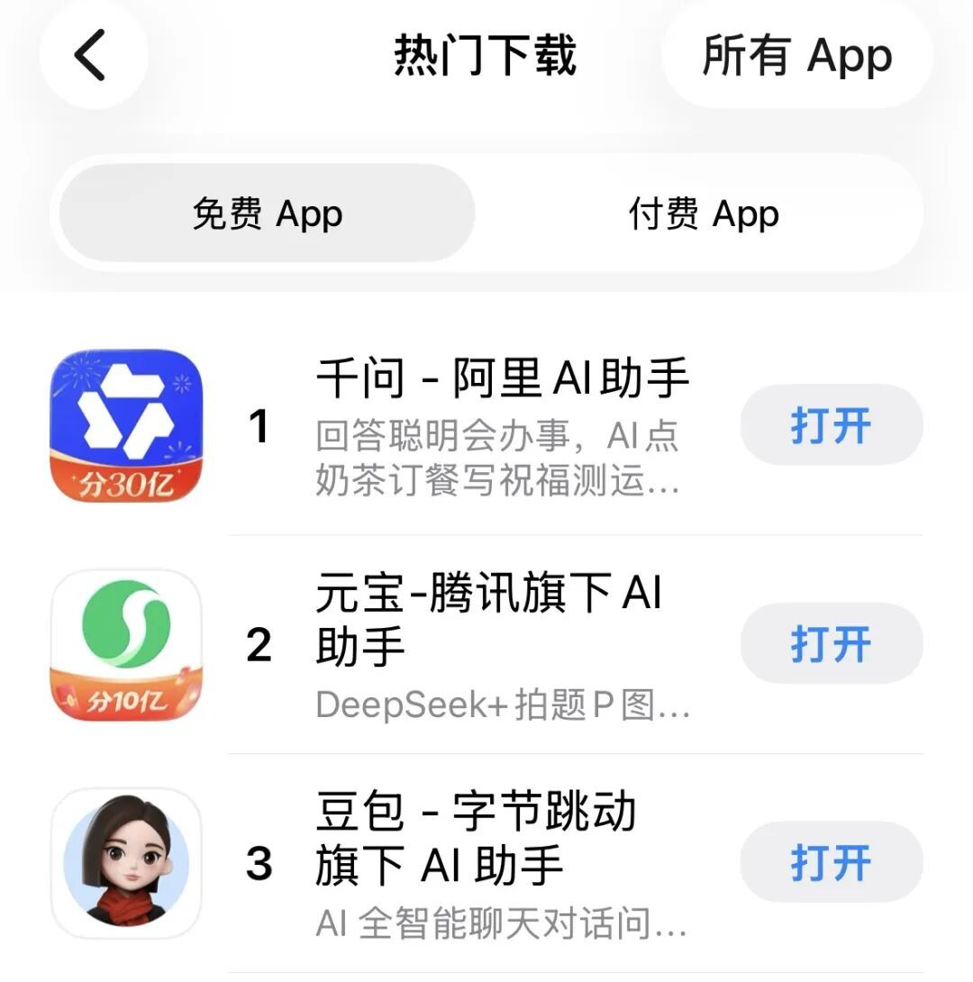 千问这场酣畅淋漓的偷袭,让茶饮打工人恼火,让骑手暴躁,让消费者久等,但也带来了切切实实的数据。下午2点,千问登顶苹果App Store免费应用榜,而第二名正是前段时间撒钱10亿的元宝,第三名是字节旗下的AI应用豆包。三大互联网巨头整整齐齐的样子,成了AI大战全面铺开的一个缩影。