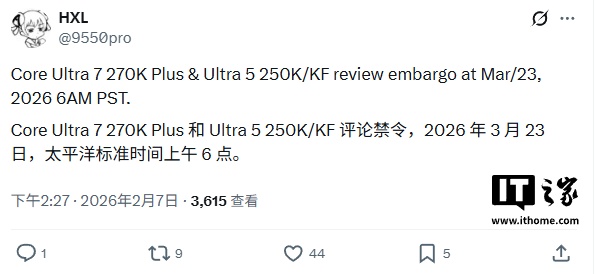 IT之家 2 月 7 日消息,爆料人 @9950pro 今日透露,英特尔 Arrow Lake Refresh 处理器三款型号将于 3 月 23 日晚 22:00 评测解禁,包括酷睿 Ultra 7 270K Plus、Ultra 5 250K/KF。