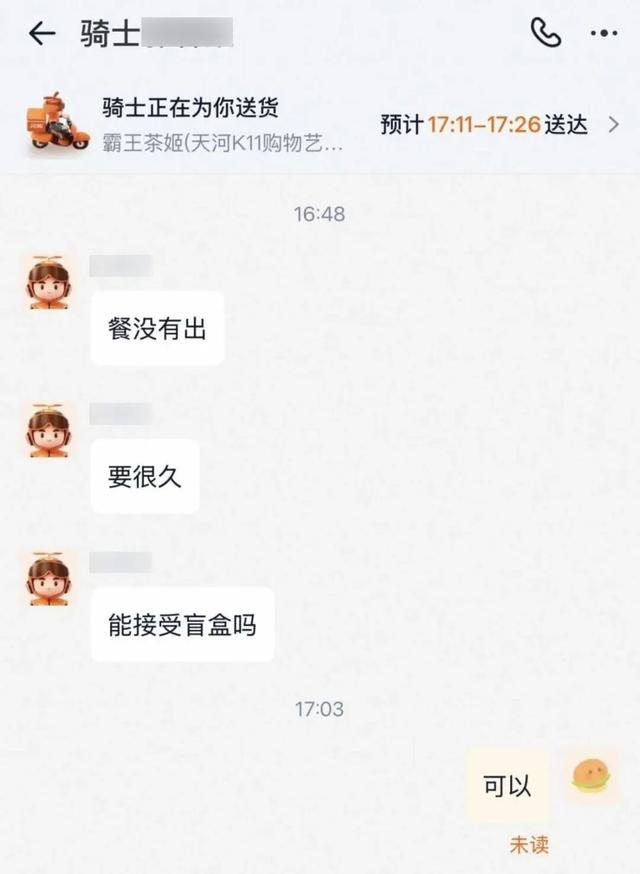 比如这个兄弟点了杯奶茶,可由于单子实在是太多,骑手在店里等得快崩溃了,直接在对话框里发出了灵魂质问:“餐没有出,要很久,能接受盲盒吗?”