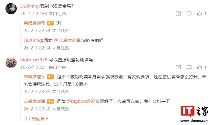 有网友询问强制 165Hz 高刷是否为全局?席迎军给出肯定答复:“对。”还有网友询问可以直接设置功耗墙吗?席迎军表示:“这个平板功耗墙本身默认就很极限,有安规要求,还在尝试着看怎么打开,未来会持续迭代,这个只是 1.0 版本。”