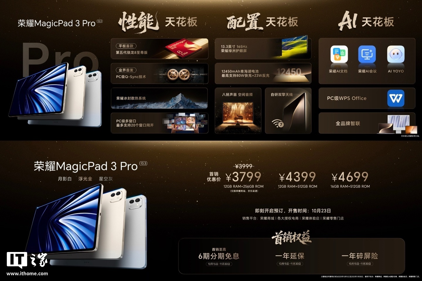 参考IT之家此前报道,荣耀 MagicPad 3 Pro 旗舰平板发布于去年 10 月,是首款搭载第五代骁龙 8 至尊版的平板电脑,提供月影白、星空灰、浮光金三种配色及 12+256GB、12+512GB、16+512GB 三个存储版本可选,售价 3799 元起。