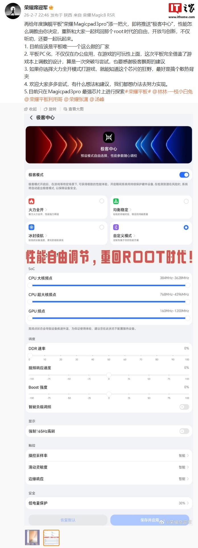 IT之家 2 月 8 日消息,荣耀全场景软件主理人 @荣耀席迎军 昨晚发文宣布,要再给年度旗舰平板 —— 荣耀 MagicPad 3 Pro 添一把火,推送“极客中心”功能,支持性能自由调节。