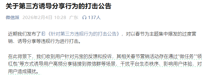 对此,微信官方账号“微信派”当日发布公告称,平台收到用户针对元宝的反馈和投诉,其相关春节营销活动存在通过“做任务”“领红包”等方式,诱导用户高频分享链接到微信群等场景,干扰平台生态秩序、影响用户体验、对用户造成骚扰。