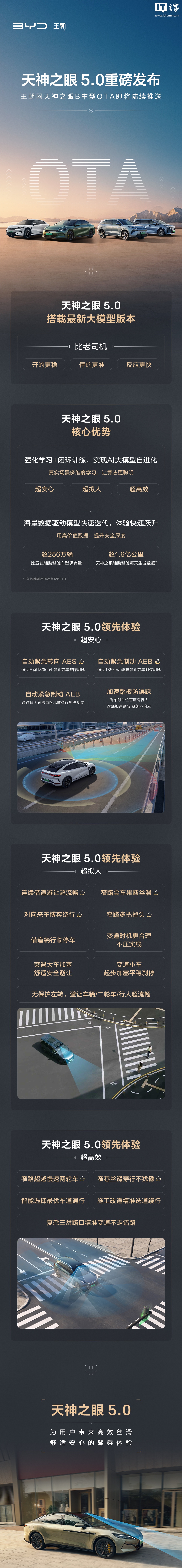 IT之家注意到,天神之眼 5.0 辅助驾驶已正式发布,搭载最新大模型版本,在全闭环端到端的基础上,新增强化学习能力,宣称比老司机开得更稳、停得更准、反应更快。目前比亚迪各车型已开启陆续推送。
