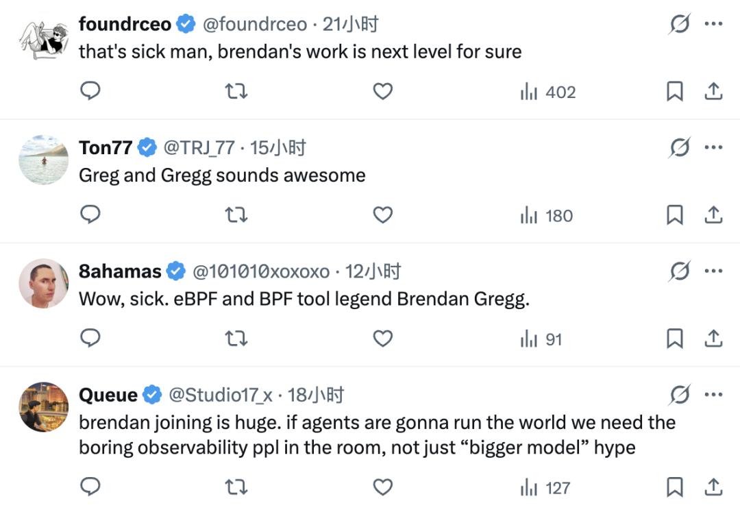 Brendan被技术圈尊称为“性能之神”,他的到来,受到了OpenAI总裁Brockman的亲自欢迎。