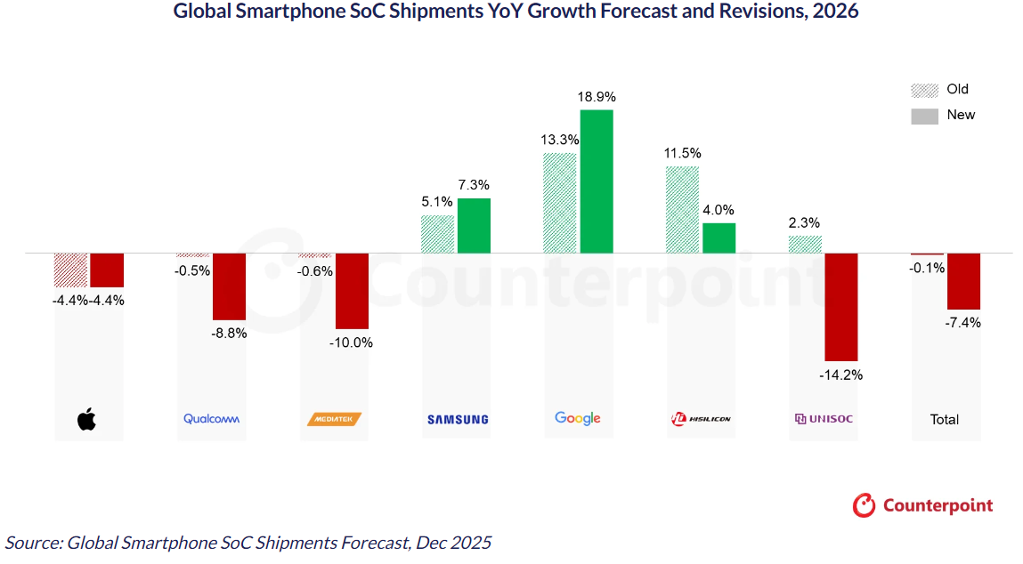 2月2日,Counterpoint Research对2026年全球智能手机SoC出货量同比增长预测进行了修正。该机构预计2026年全球智能手机出货量将同比下降6.1%,而智能手机SoC出货量预计将比2025年下降7%。其中,华为海思SoC出货量将增长4.0%,谷歌及三星分别增长18.9%及7.3%。苹果、高通、联发科SoC将分别下跌4.4%、8.8%及10.0%。Counterpoint Research表示,在SoC供应商中,紫光展锐由于其在萎缩的低端4G市场中的业务占比过高,面临最大的下滑,出货量将下滑14.2%。