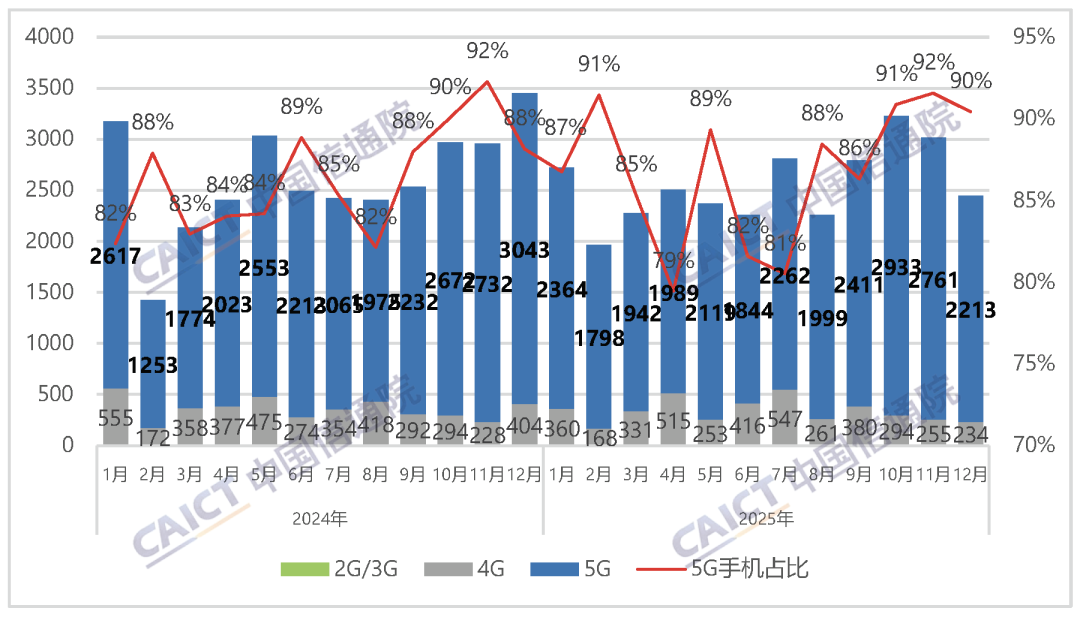- 2025年国产手机品牌占总出货量85.5%,5G手机市场份额近九成