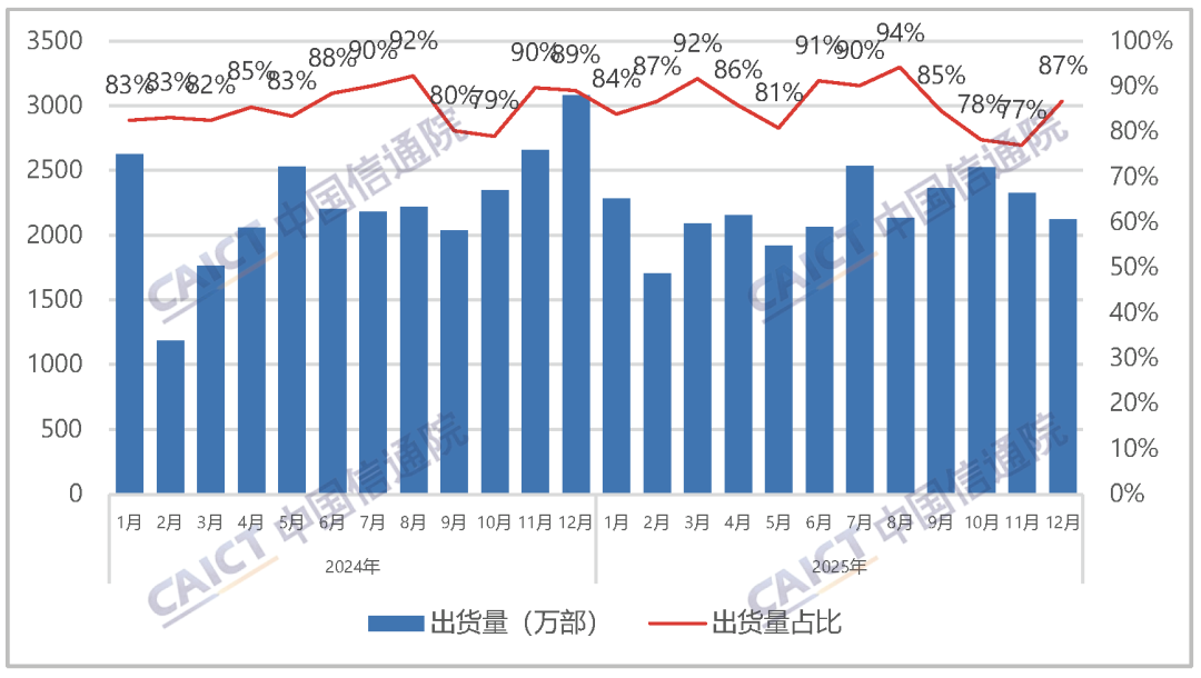 2025年1-12月,智能手机出货量2.85亿部,同比下降3.3%,占同期手机出货量的92.8%;智能手机上市新机型330款,同比增长6.8%,占同期手机上市新机型数量的64.1%。