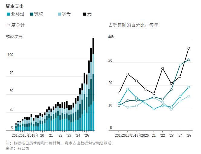从占美国GDP比例来看,这一规模已经超过了上世纪60年代的“阿波罗登月计划”和70年代的“州际高速公路系统”,仅次于1803年的“路易斯安那购地案”。仅亚马逊一家,就计划今年将资本支出增加近60%至2000亿美元。