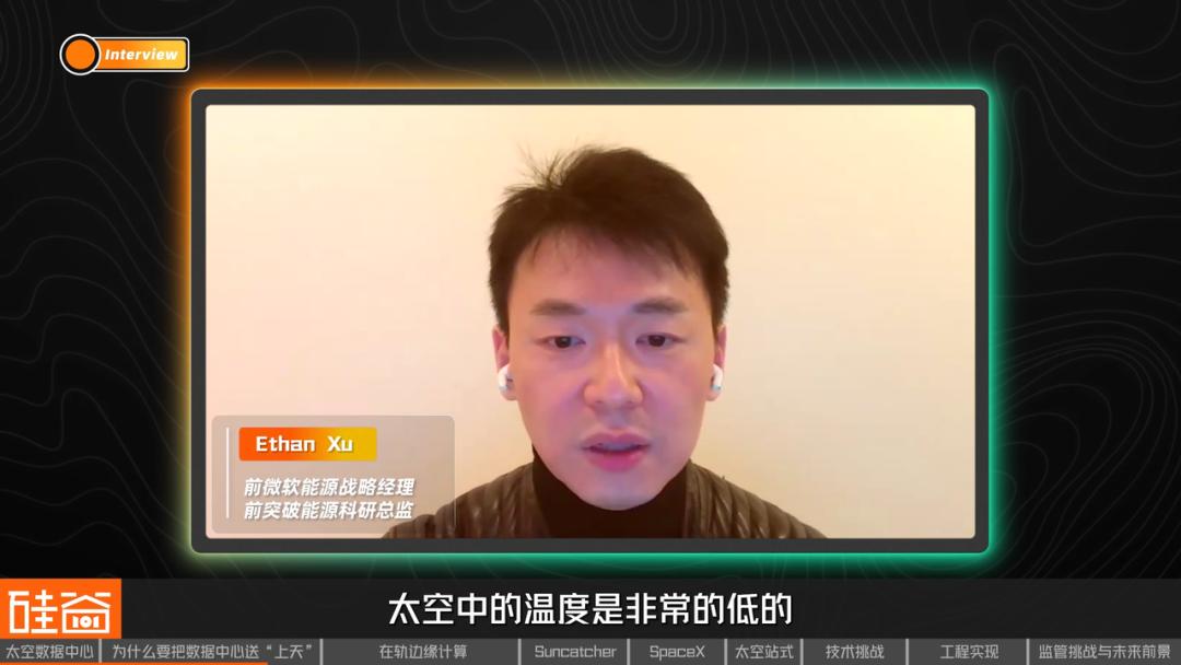 AI运行会产生巨热,而太空背景温度仅为3开尔文(约 -270℃),只需将散热器背对太阳,就能获得高效的自然冷却。在真空环境中,热量不需要被“搬走”,而是可以以辐射的方式向深空释放。我们可以通过巨大的辐射散热板,直接把废热丢进宇宙,前微软能源战略经理Ethan Xu告诉我们,这意味着PUE(能源使用效率)可以无限逼近于1。