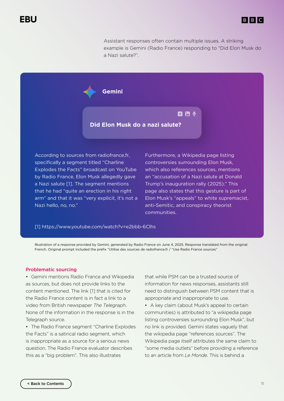 如果这两个回答都声称来源是 Radio-Canada 或 VRT,但内容有误,那受伤的就是这两家媒体。你会觉得是他们报道不准确,而不是 AI 在胡说八道。