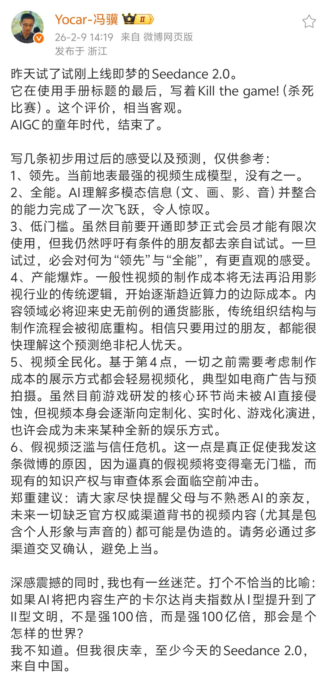 他表示,一般性视频的制作成本将无法再沿用影视行业的传统逻辑,开始逐渐趋近算力的边际成本。内容领域必将迎来史无前例的通货膨胀,传统组织结构与制作流程会被彻底重构。此外,冯骥针对“假视频泛滥与信任危机”作出提醒,“我很庆幸,至少今天的Seedance 2.0,来自中国。”他表示。