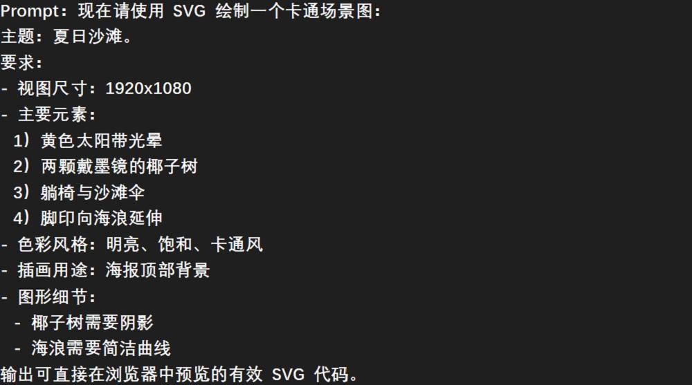 我们尝试的第二个Case是SVG卡通场景绘制。提示词非常具体:尺寸、主题、元素、风格和细节要求齐全,核心难点在于复杂约束下,模型能不能确保一致性。