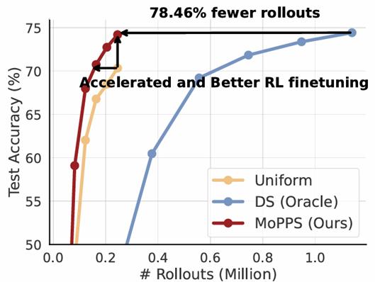 与需要大量额外推理的“先测后学”方法(如DS)相比,MoPPS达到相同性能所需的Rollouts减少了高达78.46%!