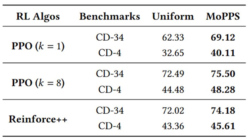 MoPPS作为“数据筛选器”可以即插即用,适配PPO、GRPO、Reinforce++等多种RL算法。