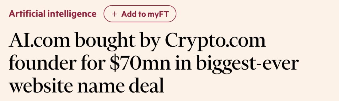 https://techcrunch.com/2026/02/08/crypto-com-places-70m-bet-on-ai-com-domain-ahead-of-super-bowl/?utm_source=chatgpt.com - https://www.ft.com/content/83488628-8dfd-4060-a7b0-71b1bb012785 - https://ai.com/company-news/ai-com-launch - https://domainnamewire.com/2026/02/06/ai-com-domain-name-sold-70-million/
