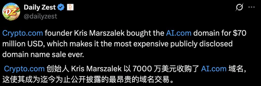 就在刚刚,Crypto.com创始人Kris Marszalek,豪掷7000万美元(约折合人民币5个亿)天价购入AI.com域名,整个硅谷科技圈炸了。