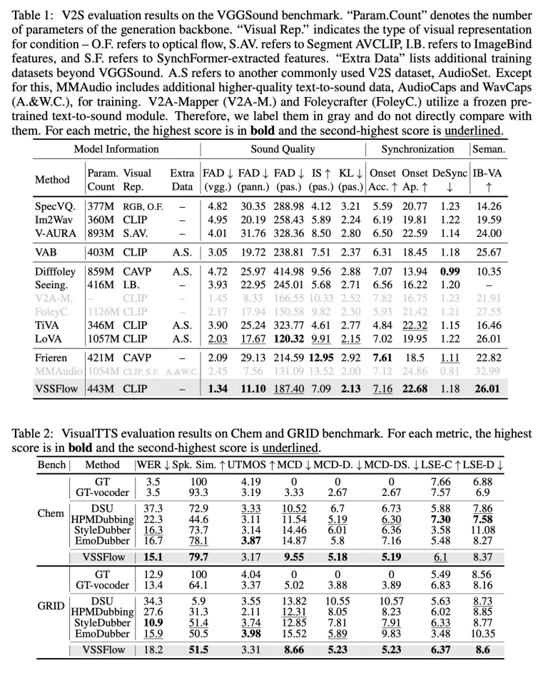 测试数据显示,该模型在多项关键指标上均优于专门针对单一任务设计的竞品模型。研究团队目前已在 GitHub 上开源了 VSSFlow 的代码,并正在推进模型权重公开及在线推理演示的开发工作。