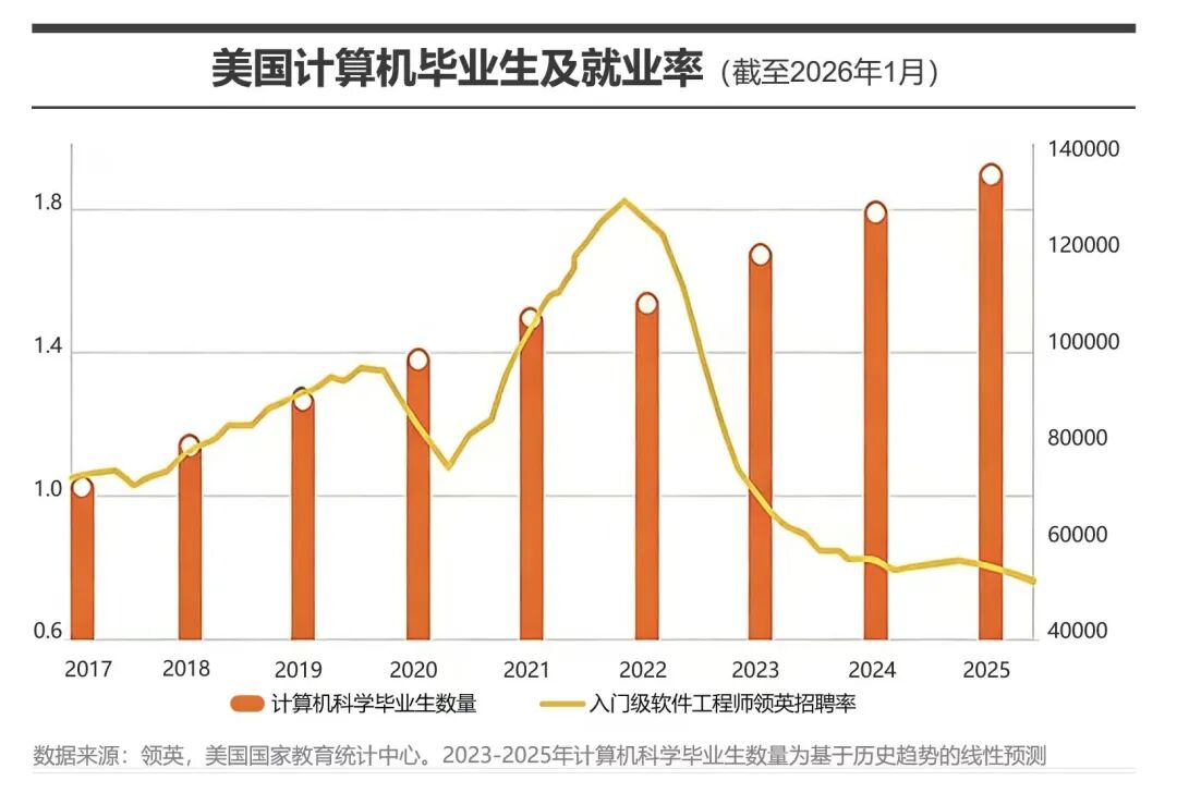 大学扩招:一方面,美国各所大学的计算机科学专业的毕业生,人数逐年攀升,并在2025年创下历史新高。大学不断扩大计算机科学专业的规模,因为长期以来,软件工程被认为是最安全的职业选择。美国大学的相关专业也成了各国留学生的第一选择。