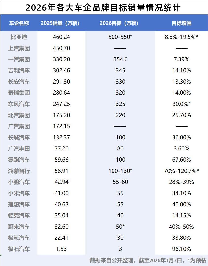 13家已公布目标的企业,合计销量目标高达2500万辆,同比增长约15%,远超中汽协全年3475万辆(同比+1%)的预测,这意味着2026年的竞争将更为激烈,只是内卷形式从同质化消耗转向差异化价值创造。