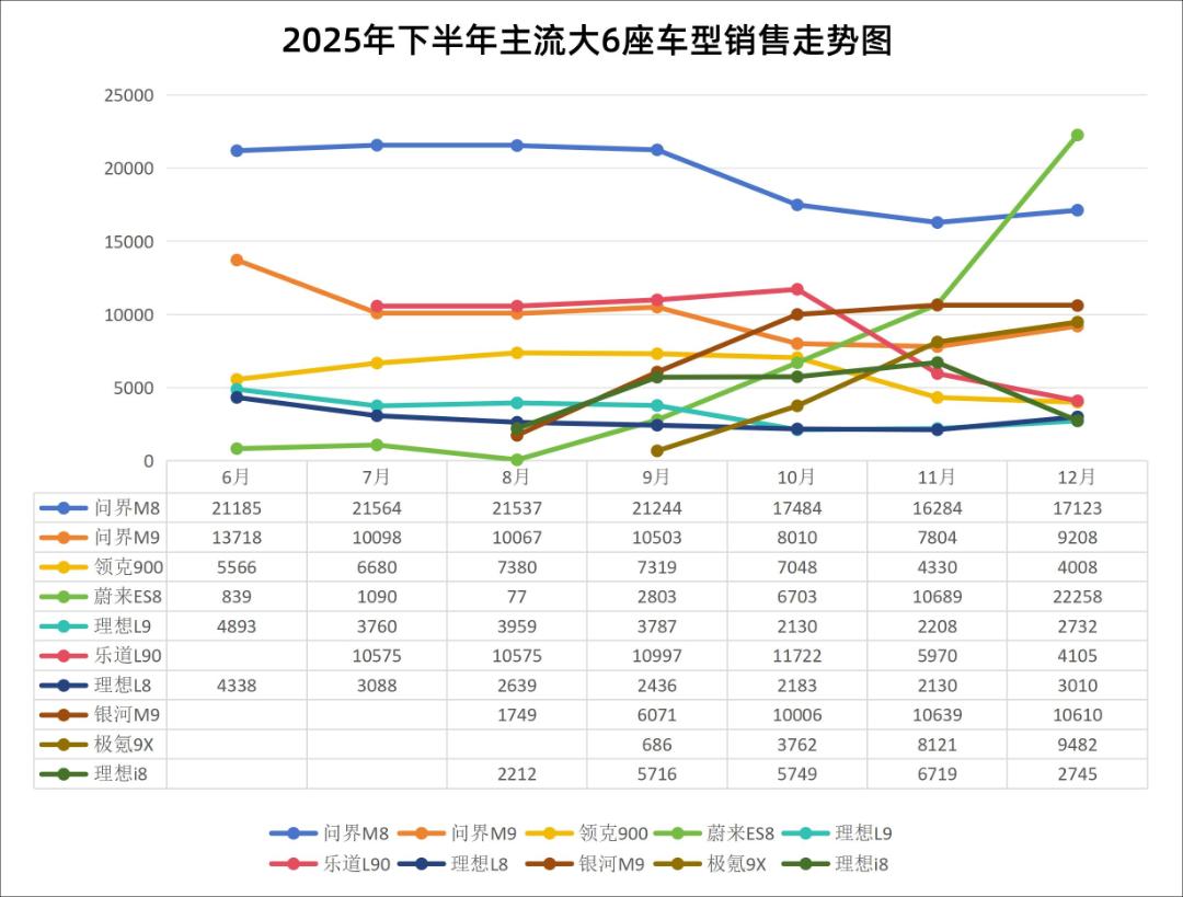 其它赛道早已拥挤不堪,但大六座SUV凭借家庭用户的刚性需求、高端化的价值属性,成为少数仍保持双位数增长的新蓝海。2025年它累计销量突破108万辆,同比增长18.3%,曾由理想独霸天下的市场,如今已挤满问界、极氪9X等和腾势N8L等实力派玩家。