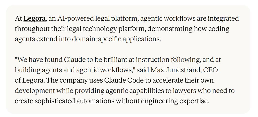 Legora的CEO Max Junestrand表示,Claude在「遵循指令、构建智能体和智能体工作流」方面表现出色。律师可以在没有工程背景的情况下,创建复杂的自动化流程。