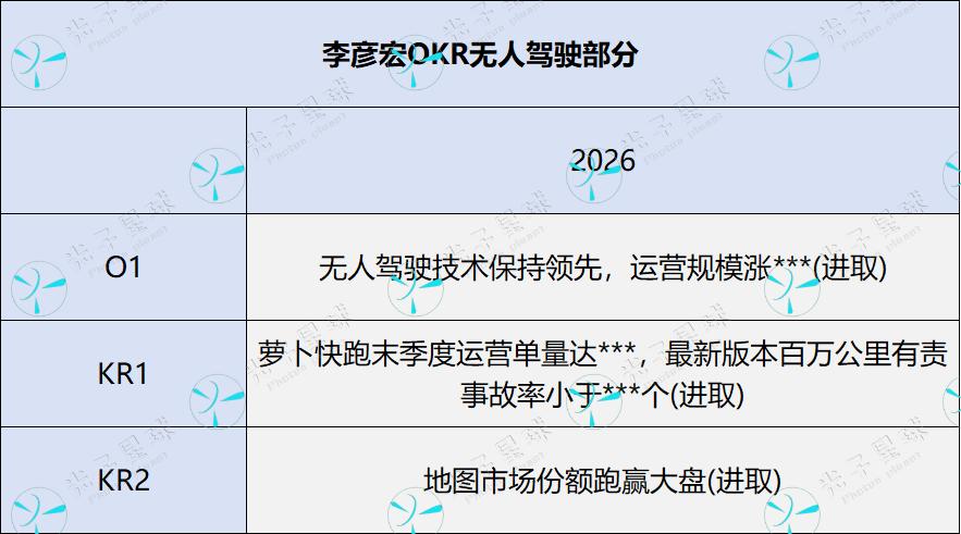 2025年一季度,李彦宏OKR包括4个目标与11个关键结果中,进取型仅为3个,使得去年百度业务策略上呈现出较保守的风格。一年之后,李彦宏的4个目标与12个关键结果中,进取型占到了8个。其中移动生态占到2个、智能云+硬件业务占到3个,自动驾驶3个。