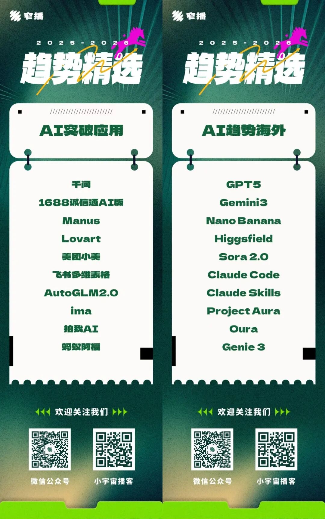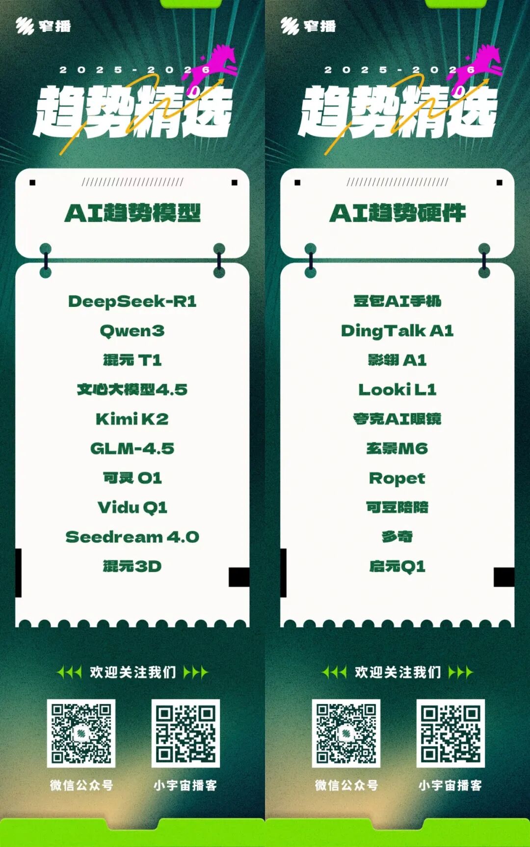 基于对AI发展趋势的以上总结及预判,以下是窄播编辑部筛选出的2025-2026年度趋势模型、硬件、突破应用以及海外趋势产品。