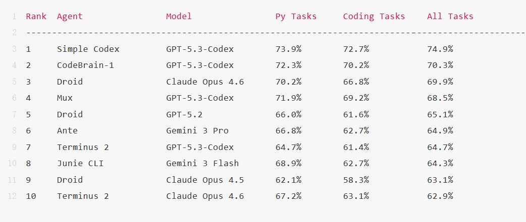 在Terminal-Bench官方评测网站的最新排名显示,CodeBrain-1仅次于Open AI的Simple Codex(GPT-5.3-Codex),Factory的Droid使用Anthropic最新基模Claude Opus 4.6排名第三。