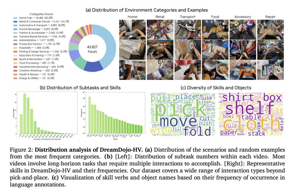 为了达成这个目标,英伟达团队构建了一个 DreamDojo-HV(加上 In-lab 与 EgoDex)的数据集,是一个约 44,711 小时的第一视角人类交互混合数据集,覆盖极其广的日常场景与技能分布。包含上万级场景、数千级任务、数万级对象的长尾分布。