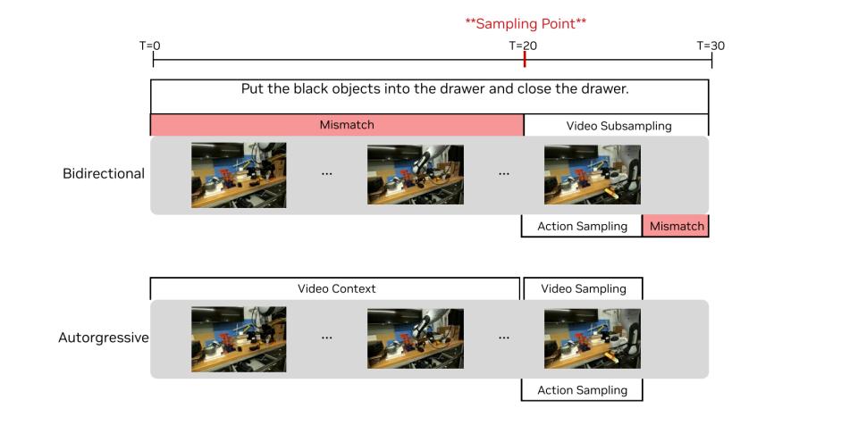 其次,针对UVA的时空错乱问题,DreamZero彻底抛弃了早期的双向架构,转而构建了一个14B参数的自回归 Diffusion Transformer (DiT)。这是目前标准的视频生成模型架构。它像语言模型生成文本一样,严格按照时间顺序,从左到右预测视频和动作。在同一次扩散前向里,同时预测视频与动作。