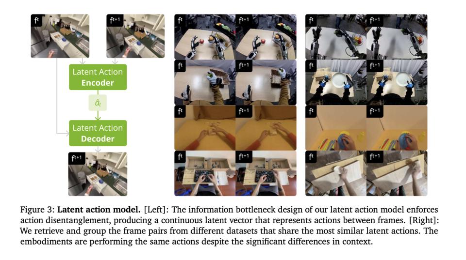 这彻底打通了不同具身体之间物种隔离。 不同身体、不同场景做同一种动作,潜动作会趋于相近。模型不再需要知道手肘电机转动 30 度,它只需要知道这个潜在动作会导致杯子被拿起。