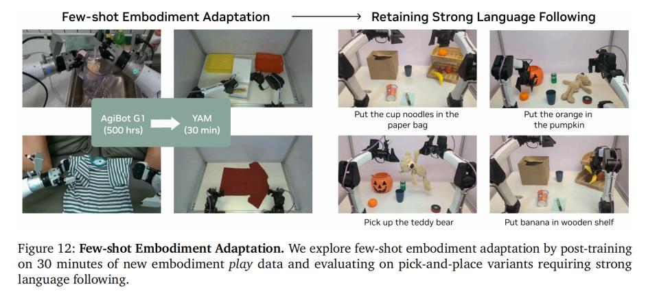 随后,他们把在AgiBot上训练的模型,直接迁移到一台完全不同的YAM机器人上。仅仅给它喂了30分钟的非结构化「玩耍数据」(Play Data),模型就完成了躯体适应,并且完美保留了零样本泛化执行复杂指令的能力。