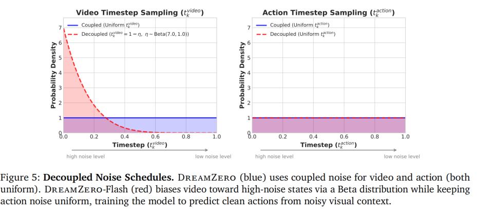 DreamZero-Flash的解法是「解耦噪声调度」。在训练时,它不再让视频和动作处于相同的噪声级别。它强制模型看着极度模糊、充满高强度噪声的视觉画面,去预测完全干净、精准的动作信号。这等于是在训练模型在看不清未来的情况下,凭借物理直觉做出正确反应。