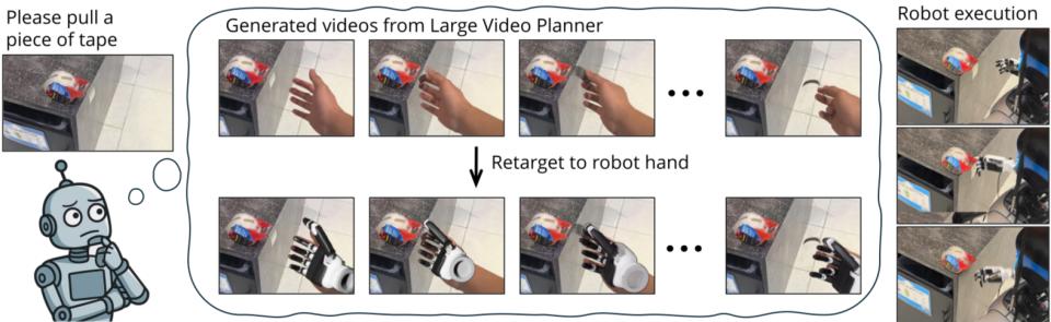 比如 LVP(大规模视频规划器)。它的思路是从一张图和一句话,直接生成应该如何完成任务的未来视频计划。再把视频中的人手运动重建成 3D 轨迹。是用视频预训练,而不是语言预训练,作为机器人基础能力的主轴。