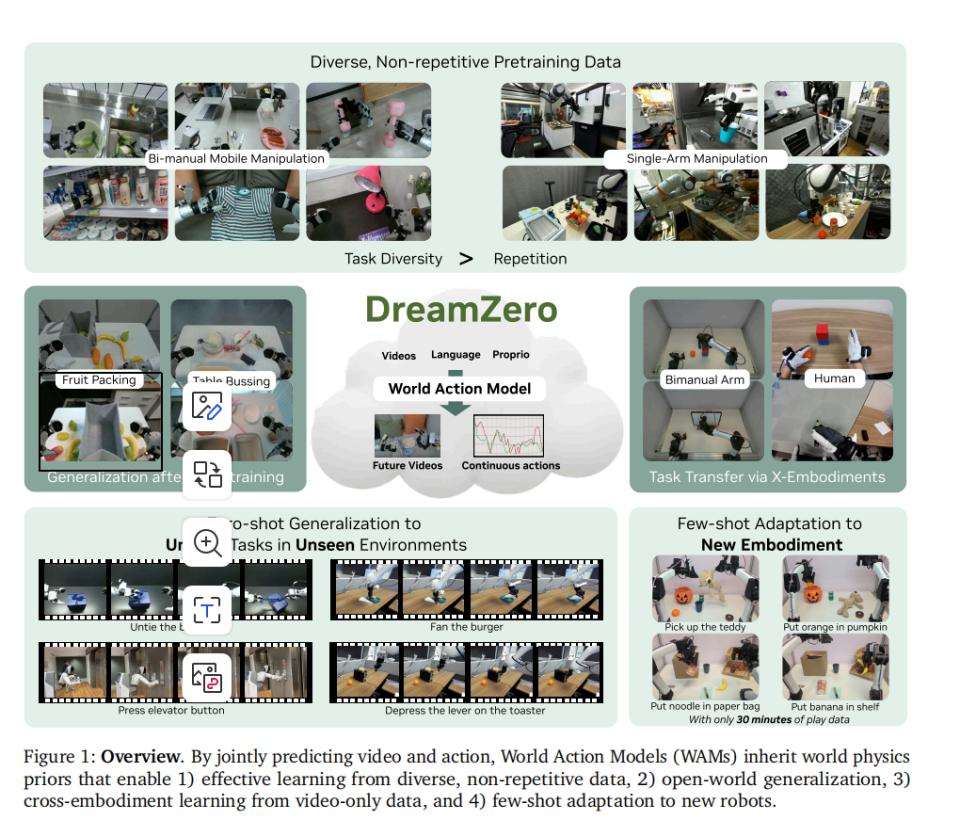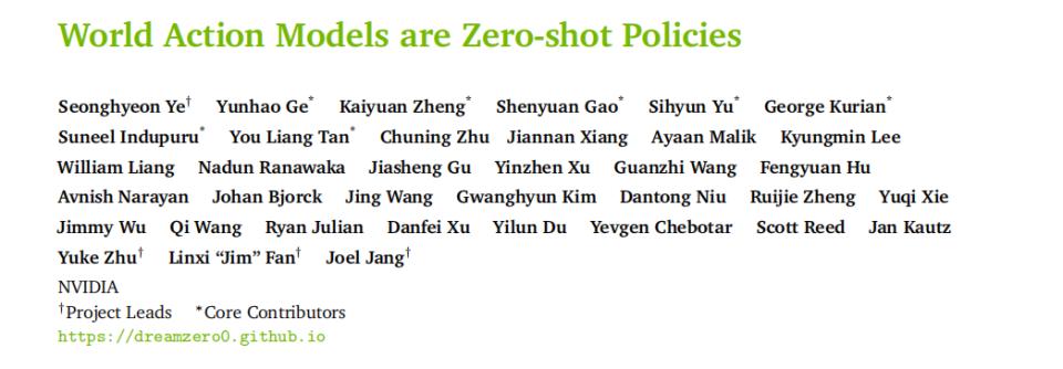 但2026年初,英伟达(NVIDIA)发布了两篇论文《DreamZero: World Action Models are Zero-shot Policies》和《DreamDojo: A Generalist Robot World Model from Large-Scale Human Videos》两篇论文,构建了一套全新的具身智能基础模型范式,打破了数据内卷的僵局。
