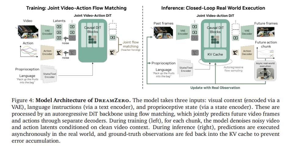 首先,DreamZero采用了视频和动作预测同步端到端训练的方式。这就解决了过去分阶段模式的不对齐问题。