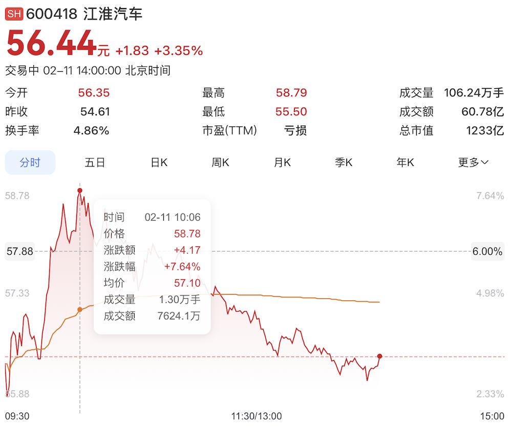 或受诸多利好消息影响,今日开盘,江淮汽车A股股价一度上涨7.64%,股价达到58.78元/股,总市值一度来到1284亿元,较昨日收盘时的1193亿元市值增加91亿元。截至发文时间,市值回落至1233亿元。