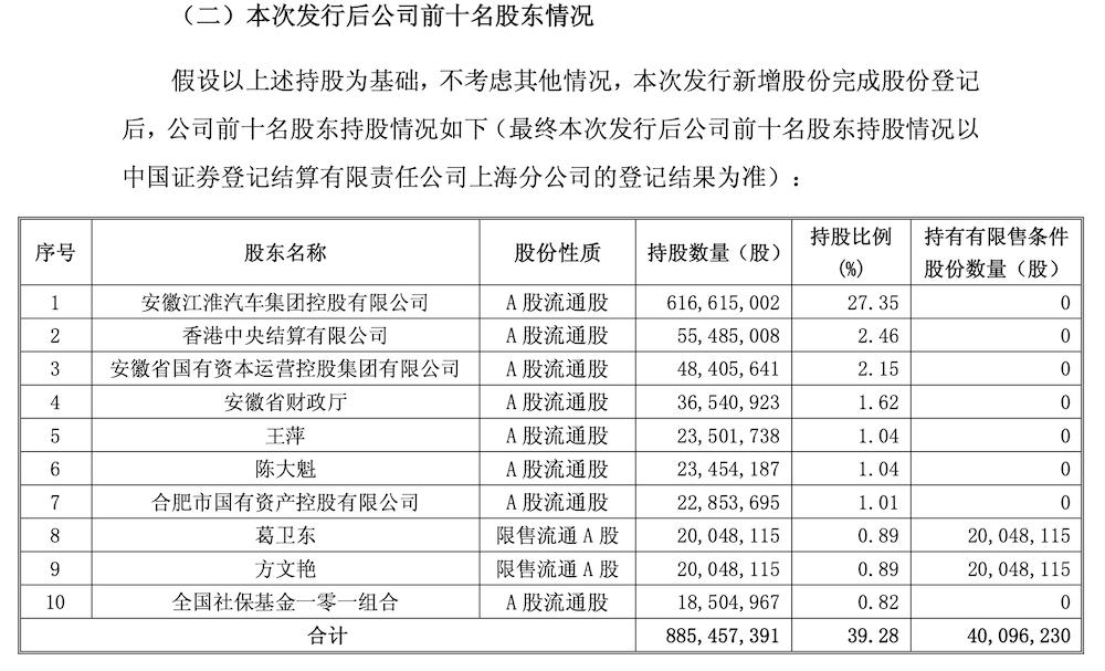 本次发行后,江淮汽车前十大股东名单更新,葛卫东、方文艳并列成为江淮汽车第8大股东。