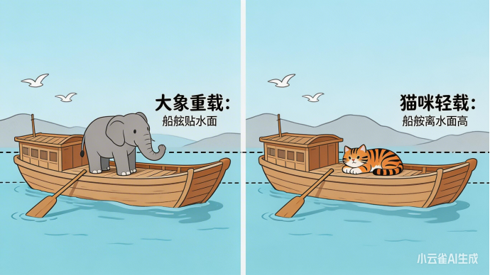 提示词:曹冲称象。一条船浮在水面上,船上站着一头大象,船身吃水很深,水面快要漫过船舷。旁边对比一张同样的船,船上只有一只猫,船身浮得很高。