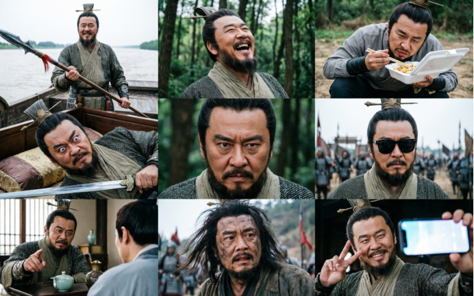 提示词:曹操赤壁战败后,为了挽回颜面,发了一组九宫格自拍展示“魏王风采”。