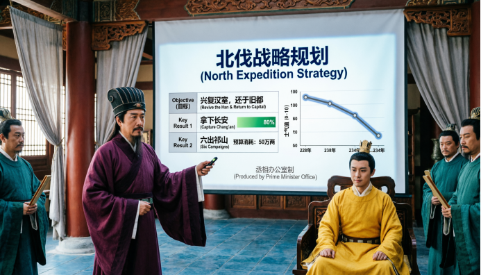 提示词:诸葛亮正在给刘禅汇报《2026年北伐战略规划》,但他不用竹简了,改用现代PPT。