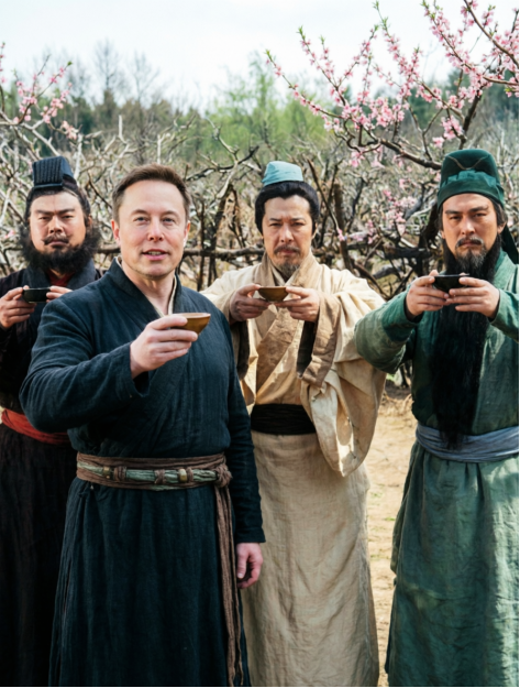 提示词:这是三国中桃园结义的场景。请将图2的人物(马斯克)自然地融入图1的场景(桃园结义)中,让他站在刘备的左侧,同样举着酒杯。统一光影为桃园的柔和自然光,人物穿着要改成汉代风格的长袍,但保留图2人物的面部特征。画面构图要平衡,四人结义。